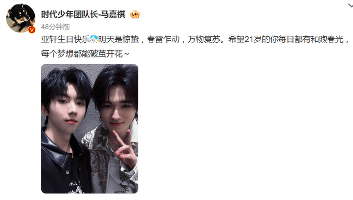 时代少年团队长-马嘉祺 分享了合照并祝福:亚轩生日快乐!希望21岁的你每日都有和煦春光,每个梦想都能破茧开花!网友:嘿嘿,宋亚轩21岁的第一张照片是和马嘉祺一起拍的,从同班同学到浪漫的《走马》四手联弹。