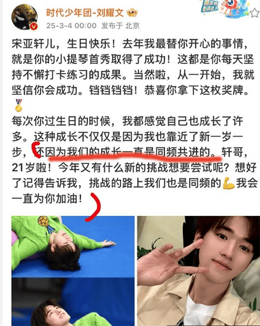 3月4日00:00分,时代少年团-刘耀文给宋亚轩P了奖牌,送来祝福了!网友直呼:卡点,好有仪式感,已经持续六年了,是永远的零点卡点的祝福和不变的称呼。刘耀文还说:和宋亚轩的成长是同频共进的!挑战的路上我们也是同频的!