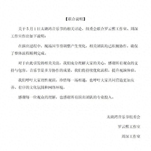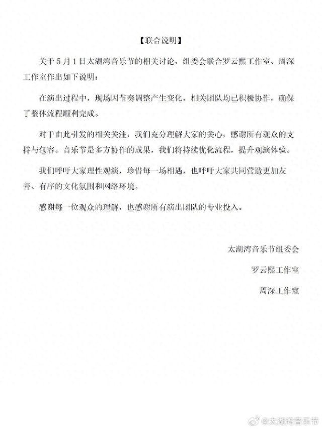 5月4日,太湖湾音乐节组委会“关于5月1日太湖湾音乐节的相关讨论”,联合罗云熙工作室、周深工作室作出如下说明:
