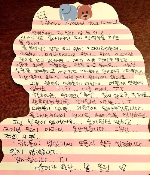 朴春公开亲笔信就2NE1解散向粉丝致歉