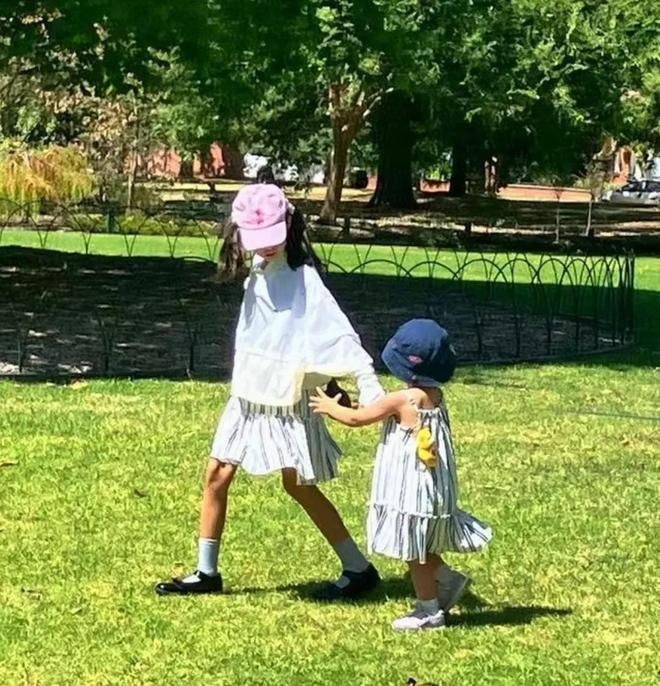 这次昆凌一碗水端平,除了庆祝儿子拿奖杯,还另外分享了两个女儿的近况,大女儿海瑟薇带着妹妹在草坪上散步,大公主快10岁,遗传了妈妈的苗条身形,瘦得膝盖都凹陷了,戴粉色帽子甜酷十足。三胎女儿很明显是个呆萌小可爱,穿着小裙子跟姐姐拉手,后背还有一只玩偶,姐妹俩有种岁月静好的感觉。