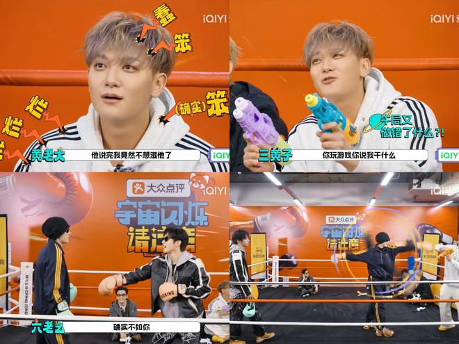拳击擂台猜词环节更热闹,本以为拳击台上是体力游戏,结果是脑力游戏。王鹤棣这期延续“游戏王”风采,和刘耀文组成的“川渝兄弟”默契十足,猜词时疯狂diss黄子韬,一个递词一个猜,配合得跟说相声似的。黄子韬忍不住开始报仇,拿水枪疯狂捣乱,最后被王鹤棣一套“风火轮拳击”直接制裁,王鹤棣那拳速快到黄子韬根本来不及躲,场面十分好笑。