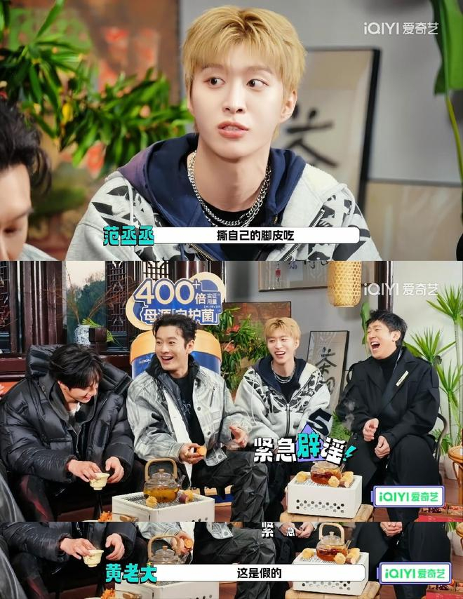 围炉煮茶画风突变,节目组安排“真假故事挑战”,全员变身编故事大王。范丞丞上来就放大招,一本正经说黄晓明有“撕脚皮吃”的习惯,这清奇脑洞直接给全场整不会了。黄晓明差点没笑出来:“这是假的!我澄清一下!”但大哥对脚的“执念”从此成了新梗,后面脚力推推赛时还被反复提起。轮到于洋时,他拿出说书般的气势,把故事讲得天花乱坠,表情语气全在戏里,听得众人一愣一愣的。讲完之后黄子韬疯狂拆台,但“于黄大棣”组合的默契就是:一个敢编,一个敢拆,互坑的时候绝不手软。