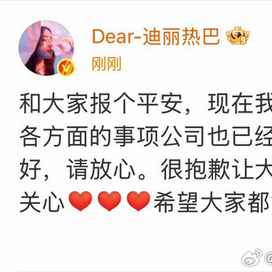 热巴报平安了,IP显示在马来西亚~为大众对她安全方面的担心和焦虑感到抱歉。后续还得解决跟品牌方的问题吧,真的辛苦了,不过平安就好!以迪丽热巴报平安微博爆的程度说明不仅粉丝,大家对她的安全非常关心。内娱对她很友好