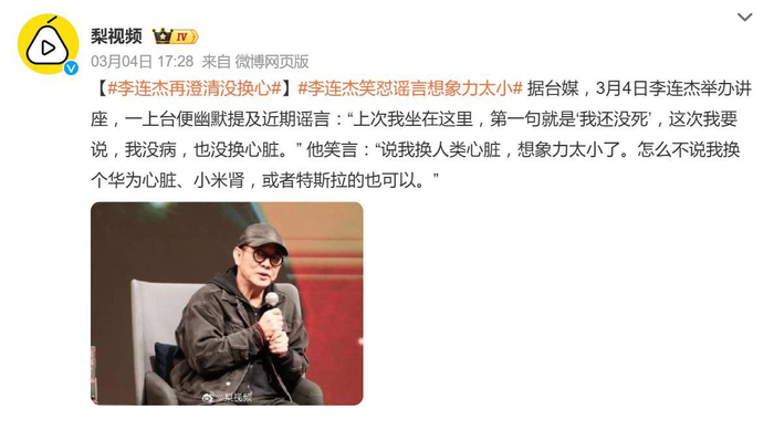 3月4日,李连杰在讲座现场一开场就直奔主题,高调澄清围绕他健康状况的种种谣言。针对最骇人听闻的“更换心脏”说,他直言不讳:“我没病,也没换心脏。”并给出了一个无法反驳的医学逻辑——换心脏的前提是器官病变,而自己心脏健康,根本无需更换。