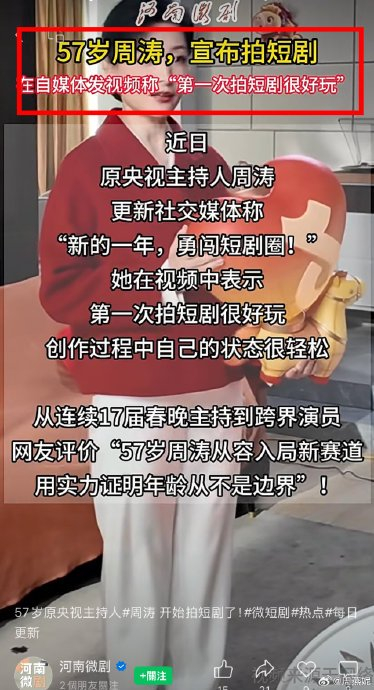 连续主持17届春晚的周涛,以“新的一年,勇闯短剧圈!”高调入场。低温拍摄时贴暖宝坚持台词一条过,将主持人语言张力注入表演,自述“第一次拍短剧很好玩”。