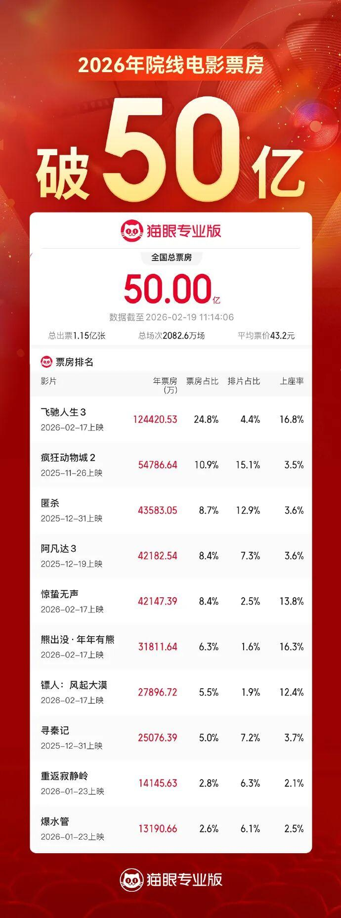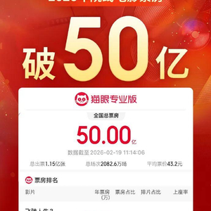 据猫眼专业版数据,截至2月19日11时15分,2026年年度总票房(含预售)突破50亿。