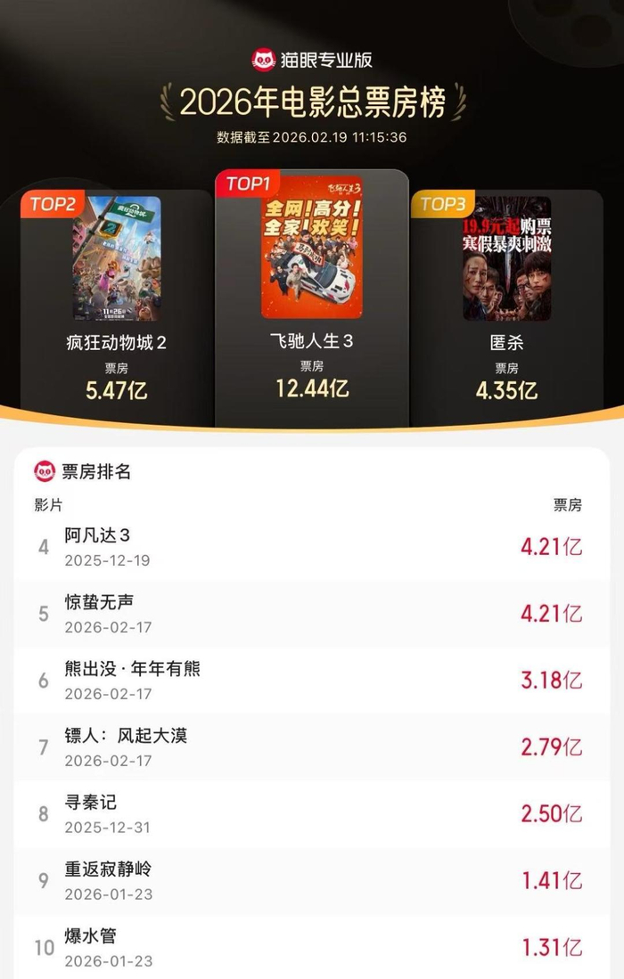 2026年度电影总票房破50亿!《飞驰人生3》《疯狂动物城2》《匿杀》暂列年度票房榜前三位