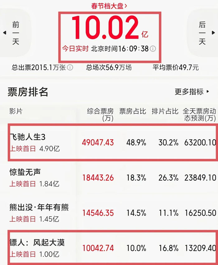 春节档大盘10.02亿的票房,《飞驰人生3》贡献了4.9亿,约占大盘的48.9%,不得不说,韩寒真的是赢麻了,而期待《飞驰人生4》的观众也终于可以把悬起来的心放下了。