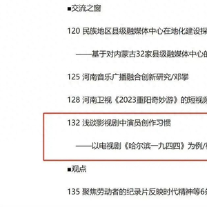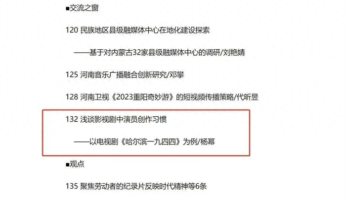 《浅谈影视剧中演员创作习惯——以电视剧〈哈尔滨一九四四〉为例》——日前,在《中国广播电视学刊》今年第6期中,一篇署名“杨幂”的文章引发关注。随后,该刊主办单位中国广播电视社会组织联合会向媒体证实,这篇文章的作者确实为演员杨幂。《中国广播电视学刊》是CSSCI扩展版、北大中文核心刊物。很快,“杨幂发论文”便成为社交网络的热搜词条。