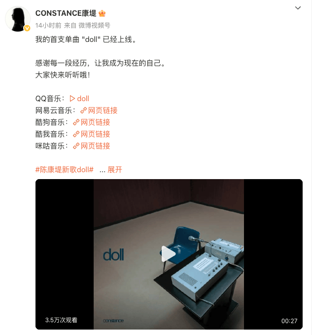 陈康堤在社交媒体发文表示:“我的首支单曲《doll》已经上线。感谢每一段经历,让我成为现在的自己。”