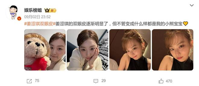 一则迅速爆红的论坛帖子里,网友晒出多张姜涩琪近期照片,清晰显示她眼皮上方出现了明显的褶皱——甚至包括她素颜状态下的自拍。这一变化立刻引发热议:“她是去做手术了吗?”“妆容效果还是真的变了?”