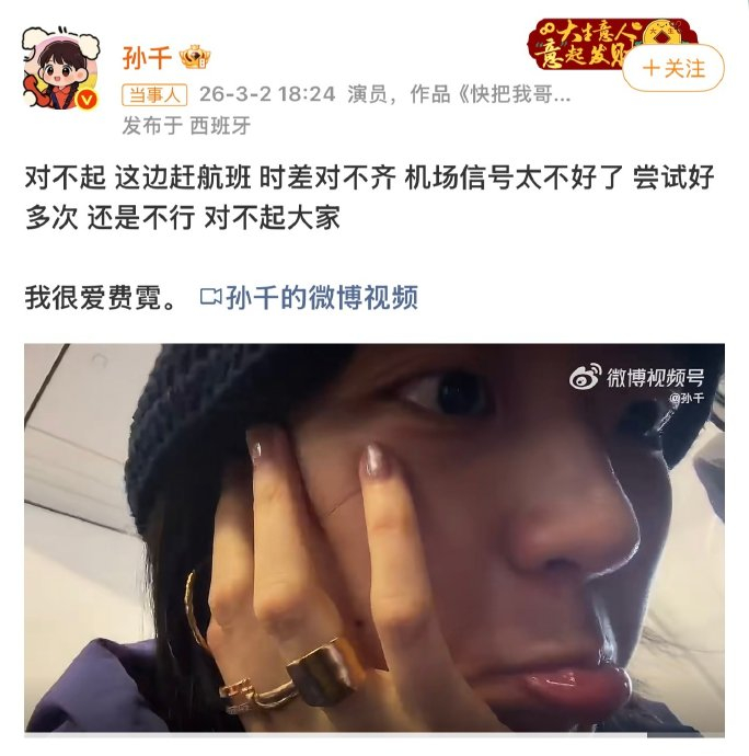直播事故见证双向奔赴:3月2日,孙千因跨国直播信号中断发文道歉,郭晓婷半小时内以剧中昵称"霓"回复:"霓不委屈 霓最好噜 霓漂漂亮亮好好工作好好玩耍等你肥来"。随后更通过视频通话让孙千接入自己直播间,完成"信号塔式救援"。网友感慨:"一个在万米高空努力挥手,一个在地面稳稳接住,比任何工业糖精都动人"。