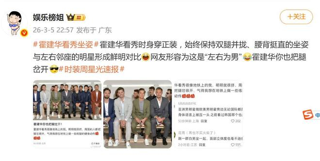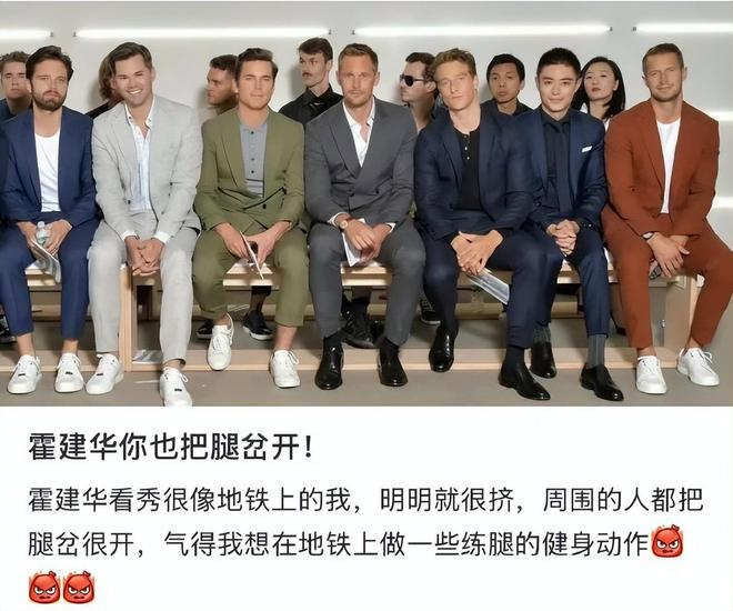 3月5日的巴黎时装周秀场前排,霍建华一身笔挺正装,全程保持着双腿并拢、双手规整平放于膝盖的标准坐姿,腰背挺直,神情专注。这画风,与邻座那些翘着二郎腿或自然岔开双腿、姿态舒展随性的欧美明星形成了戏剧性的“结界”对比。网友的吐槽接踵而至:有人形容他像极了“参加单位表彰大会的模范领导”,还有人精准捕捉到打工人共鸣,称其为“地铁上生怕碰到别人、不敢伸腿的卑微乘客”。