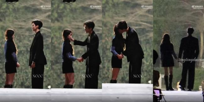 另一场吻戏设定在两人步入社会后。毕雯珺身穿黑西装、佩戴细框眼镜,斯文霸总气质拉满。两人在路边交谈间,他微微弯腰,一手轻拉张淼怡,一手扶上她的后脑,两人深情拥吻,画面甜度爆棚。