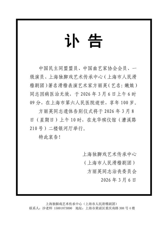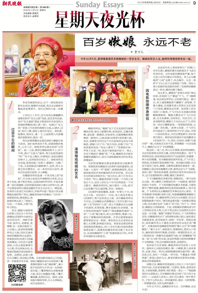 著名滑稽表演艺术家方丽英(艺名:嫩娘)于2026年3月6日在上海逝世,享年100岁。去年11月嫩娘百岁生日时,曹可凡曾为“夜光杯”撰文,重刊此文,以表怀念。——编者