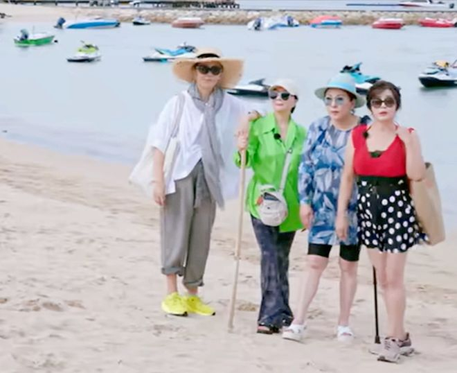 一行人去海边游玩,张蔷、李小冉、贺峻霖、牛在在去体验海上飞艇,倪萍、蔡明、向太三个老太太在沙滩无所事事,此时刘晓庆特意去换了泳装,闪亮登场,看呆了其他三个同龄人。