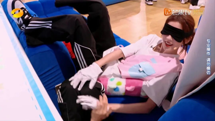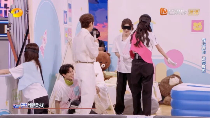 全员蒙眼挑战游戏里,孟子义、宋妍霏、张予曦三个女生要戴上眼罩,然后去抓躲藏的三位男生。