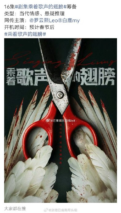 - 网传主演16集悬疑推理剧《乘着歌声的翅膀》,风格对标《漫长的季节》;