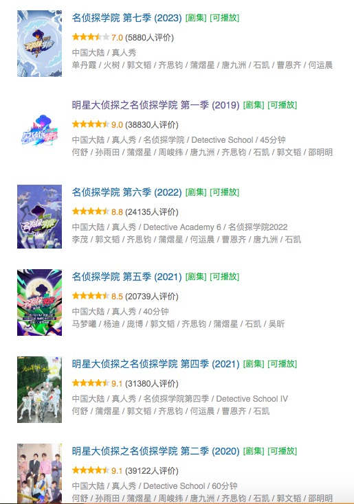 《名侦探学院》走到第七季,豆瓣7.0的分数迎来了口碑新低,凌乱的剪辑、生硬的叙事等严重影响了追综体验。要知道,虽然是衍生节目但这档节目前四季始终维持着豆瓣9分左右的评价,即使是更换制作团队、加入明星嘉宾的第五季也有8.5分的豆瓣评分。