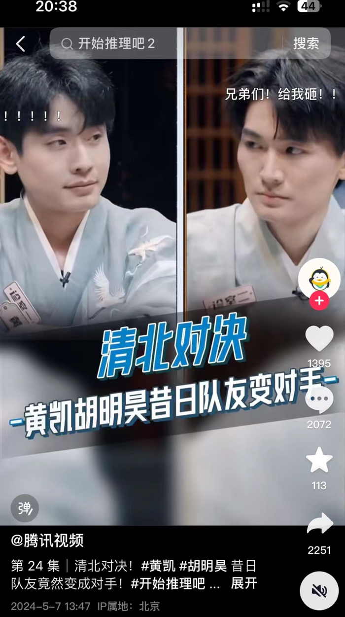 无独有偶,在腾讯视频推出的《开始推理吧》中,衍生综艺《开始动脑吧》同样集结了来自北大、清华、南大等多所名校的高材生,清北对决、双律、音乐人等标签也具有较强的对照性。