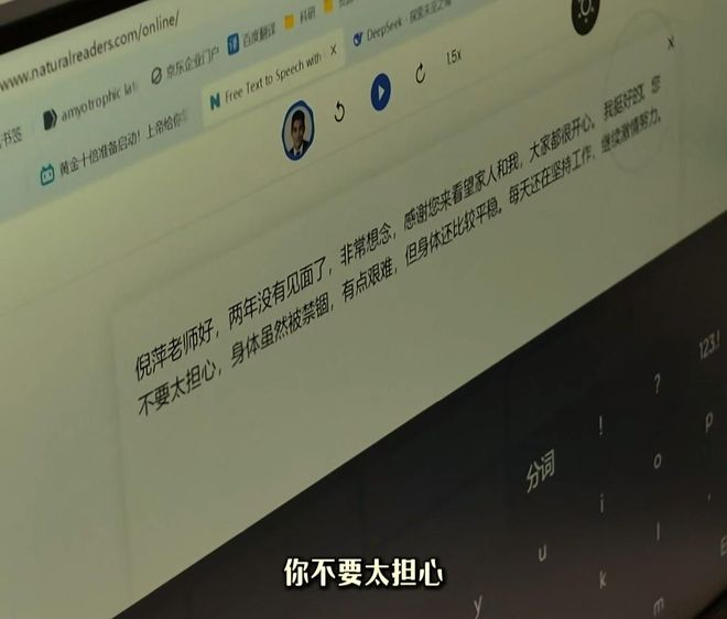蔡磊的状况现在比较差,身体早已不能动弹,目前只能通过眼控仪来控制电脑打字,跟人交流;蔡磊用这种方式跟倪萍打招呼: