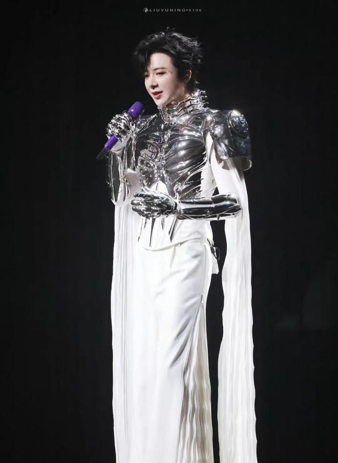 舞台上,刘宇宁造型多变,从闪耀着光芒的黑白条纹西装,到充满复古格调的格子套装,再到极具未来感的银色盔甲搭配白色长袍,每一套造型都狠狠戳中粉丝的心巴,时尚度直接拉满 。