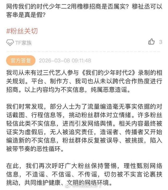 时代峰峻辟谣从未用跨代合作热度进行招商。