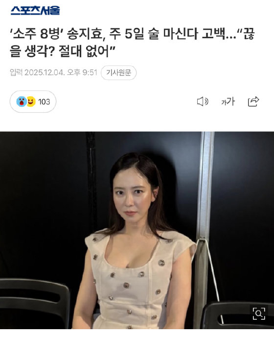 2025年12月至2026年2月,宋智孝在个人节目中多次强调绝不戒酒,直言每周饮酒高达5次,常空腹饮用"烧啤"(啤酒+烧酒混合饮品),单次饮用量达4-5罐啤酒加1瓶烧酒,并称"身体已适应空腹状态"。2026年2月28日,她公布体检报告显示肝功能正常后,更坚定表示无戒酒计划,仅称"可能适量减少"。