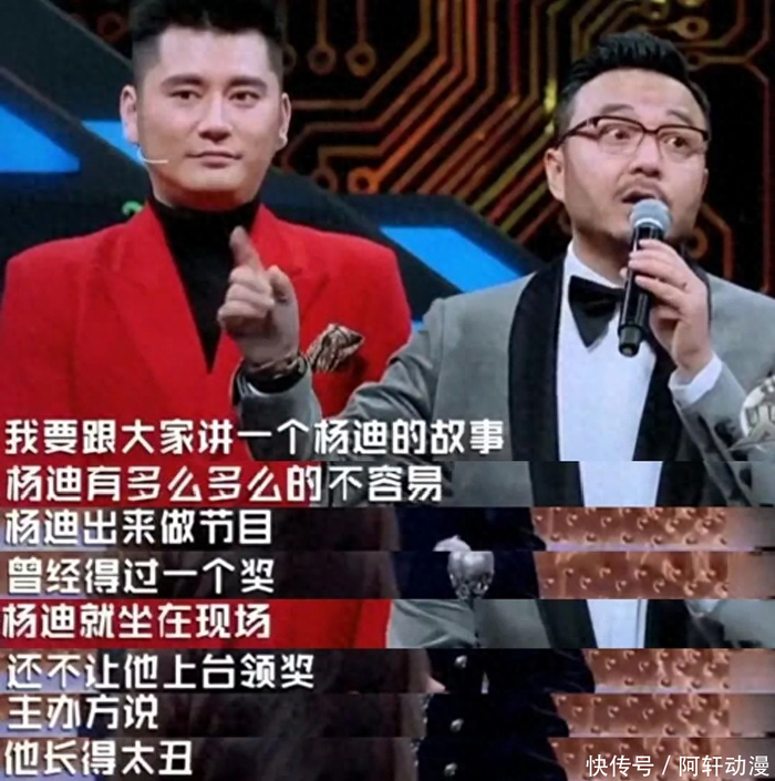 因为杨迪这样的扮丑其实也让别人认为他是个丑角,就像在一次颁奖晚会上明确得奖的杨迪却迟迟没有接到上台的通知。