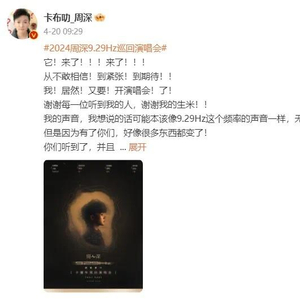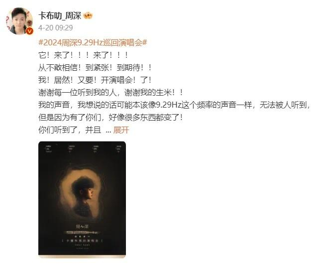 4月20日,周深在个人微博官宣2024周深9.29Hz巡回演唱会。
