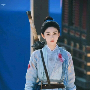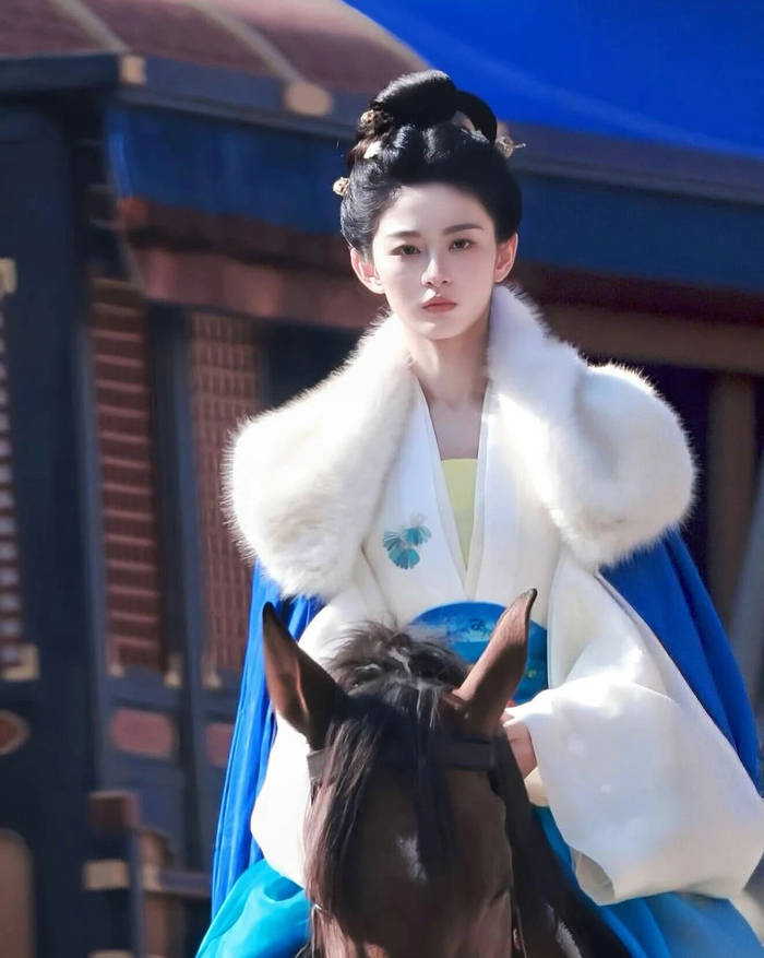 赵晴的蓝色披风搭配白色的里衣很有清冷感,淡妆风格尽显东方美人韵味,又美又仙。
