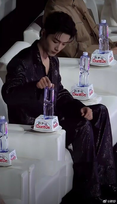 盛典内场桌面的百岁山瓶装水实为黏贴固定的装饰品,肖战率先尝试拿取未果后,低头整理鞋子掩饰尴尬;随后白敬亭同样多次用力"拔瓶"失败,愣在原地满脸困惑,被调侃"像卡顿的机器人"。最终陈伟霆提醒二人真正饮用水位于后排,两人成功喝到水后相视一笑。
