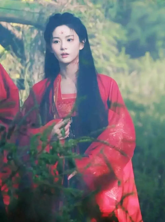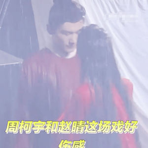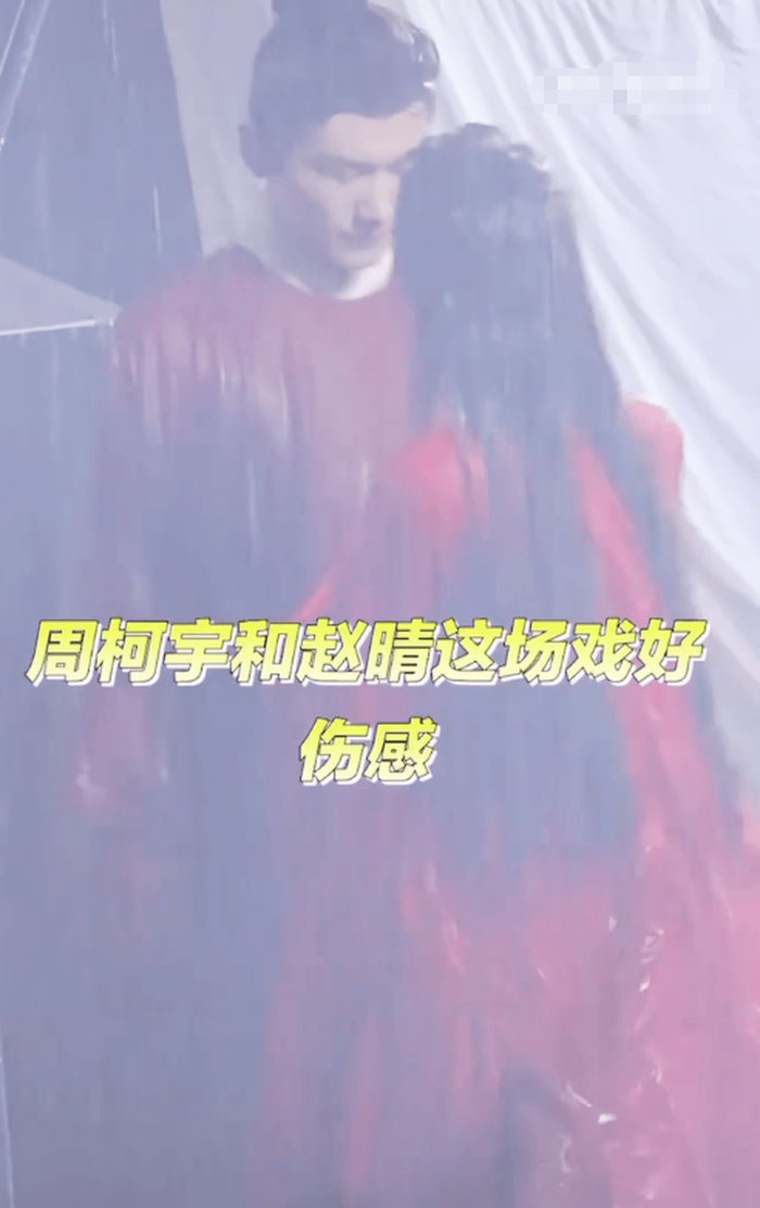 照片中的赵晴穿着红色的衣服,脸庞上带着血迹,清冷破碎的妆容很突出,在雨中扇周柯宇巴掌的戏份片段被网友评为“画面张力十足”。