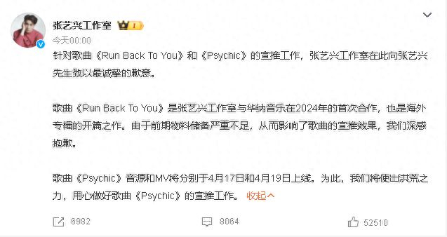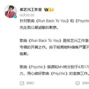 针对歌曲《Run Back To You》和《Psychic》的宣推工作,张艺兴工作室在此向张艺兴先生致以最诚挚的歉意。