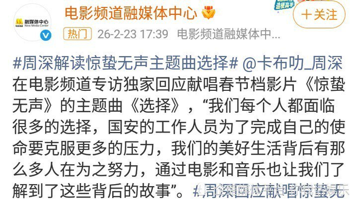 对此,网友们纷纷关注“周深解读惊蛰无声主题曲选择”话题消息!