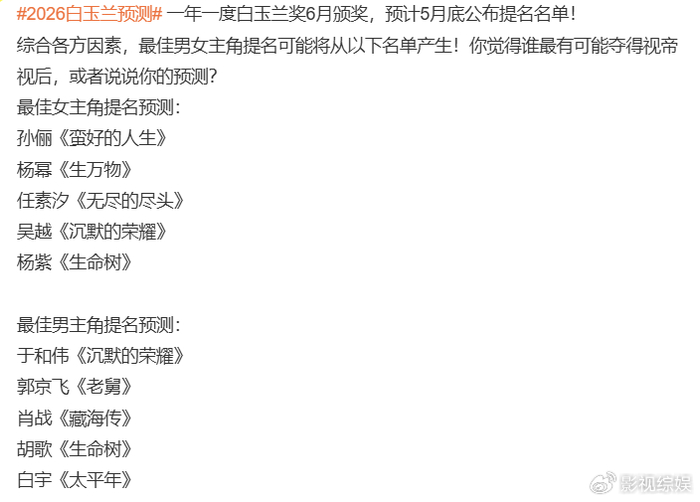 但是真的要说到拿奖,可能性还不大。虽然孙俪《蛮好的人生》呼声高,但杨幂《生万物》、任素汐《无尽的尽头》、吴越《沉默的荣耀》、杨紫《生命树》呼声也高,特别是吴越和杨紫的题材更有优势,跨度进步更大,更被看好。加上孙俪之前已经拿过两次白玉兰视后,三封意义不大,可能性小。