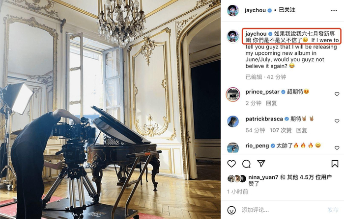 就在前几天,周杰伦曾在社交平台上发文官宣,称新专辑将在六七月份发布,还调皮问大家信不信。并且还放出了去年和知名钢琴演奏家郎朗曾拍过的照片,暗示着自己的新专辑有和郎朗合作。