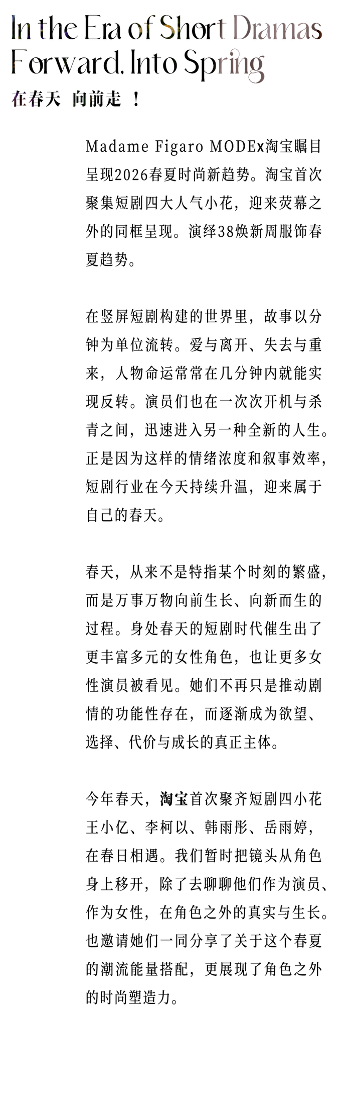 从幕后到台前,岳雨婷身上始终有一种轻盈却坚定的力量。又一个春天如期而至,她已为自己许下新的期待:继续突破,去尝试更多尚未涉足的角色。就像一阵自由的春风。风从不先问路在何方,它只是向前,沿途成为自己。