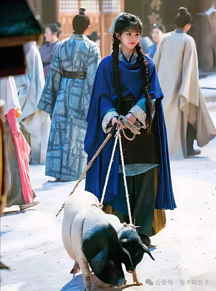 花絮画面里,田曦薇穿着繁复的古装戏服,肩上稳稳扛着一头黑白花色的小猪。小猪圆滚滚的,耳朵耷拉着,全程一动不动,表情十分淡定。田曦薇则步履轻快,脸上带着笑意,画面又萌又喜感。