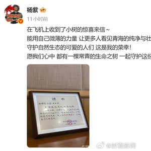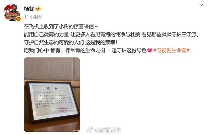 【#杨紫已获聘青海生态文化传播大使#】#杨紫生命树还有续集# 11日晚,演员@杨紫 发布的微博显示,其已获聘青海生态文化传播大使。由@杨紫 @胡歌 等主演的电视剧《生命树》,改编自可可西里巡山队的真实故事,引发广泛关注。#杨紫[超话]#