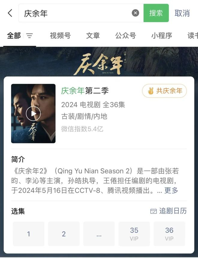 《庆余年2》还实现了微信搜一搜跟腾讯视频的首次合作,用户打开微信搜索“庆余年”即可看正片、读原著、听原曲,打通了社交、文娱、社会新闻端等多元链路,以互通的内容生态池聚合更广泛的人群,将IP势能发挥到极致。