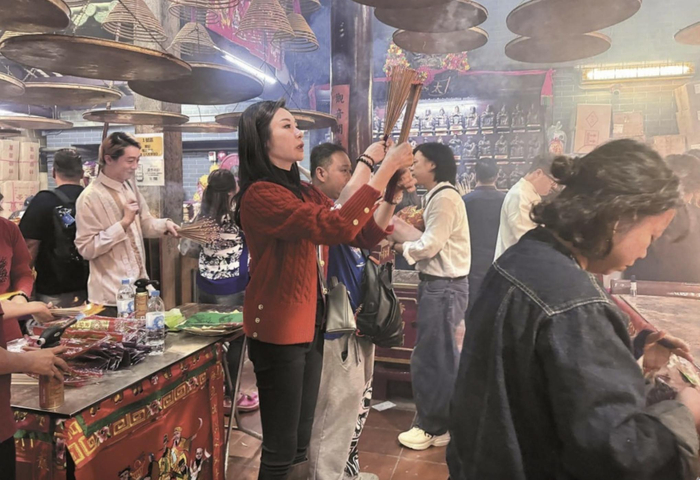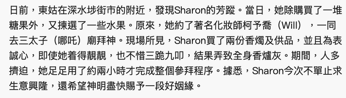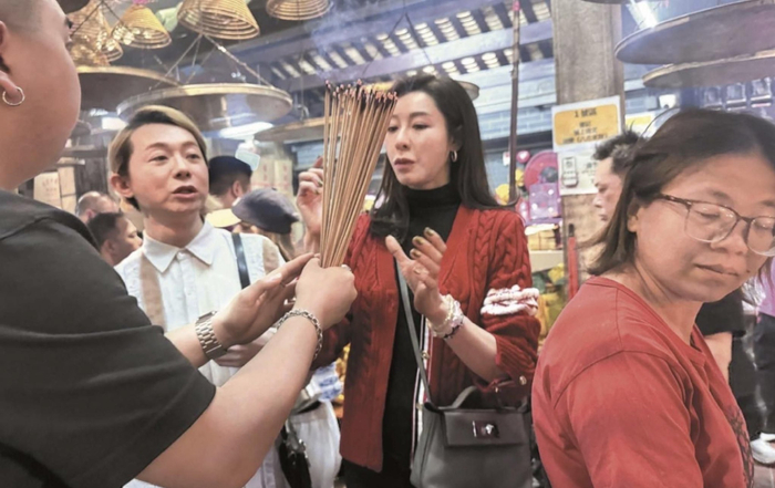 陆诗韵被曝与知名化妆师柯予乔现身街头,原本还以为两人只是在街头随便买买糖果,实际上两人还去了香港深水埗的三太子庙拜神祈福。香港的三太子庙香火旺盛,挤满了人,陆诗韵也不顾人多,前往买供品并且叩拜。