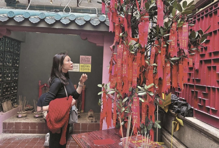 香港的三太子庙在1898年就已经创建,是香港唯一一处主祀哪吒的庙宇。由于历史悠久,还是历史建筑,所以深得市民们的信奉,不说逢年过节,就是一般的日子,都有很多市民前往叩拜。而叩拜三太子,除了消灾解厄之外,更多人祈求的是事业与财运,此外还有感情生活。对于陆诗韵来说,她拜三太子,首先求的是事业,如今她是女强人,经营内地以及护肤品生意,身份还是大湾区香港女企业家总会的副主席,自然是祈求事业顺遂。此外,她要求感情,这个也很重要,因为至今单身。而她与友人在街头买糖果,显然就是买来供奉三太子的,因为三太子喜欢糖果。
