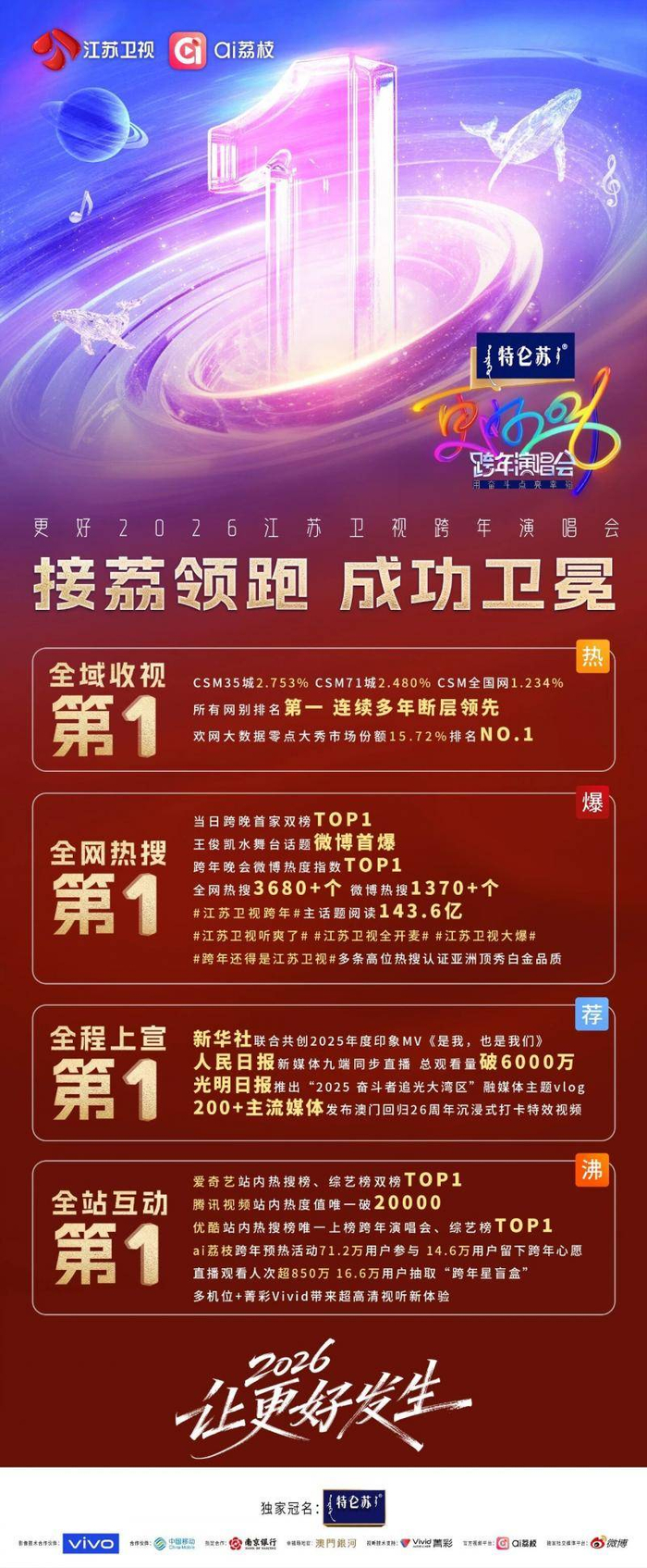 1月1日,江苏卫视官宣,《2026江苏卫视跨年演唱会》全维度成功卫冕。全域收视第一:CSM35城收视2.753%,CSM71城收视2.480%,CSM全国网1.234%,所有网别排名第一,连续多年断层领先!欢网大数据零点大秀市场份额排名第一;全网热搜第一:当日跨晚首家双榜TOP1,跨年晚会微博热度指数TOP1,晚会获全网热搜超3680+次,其中微博热搜超1370+次,王俊凯水舞台话题获微博首爆,#江苏卫视跨年#主话题阅读143.6亿,#江苏卫视听爽了# #江苏卫视全开麦# #江苏卫视大爆# #跨年还得是江苏卫视#多条高位热搜认证亚洲顶秀白金品质。