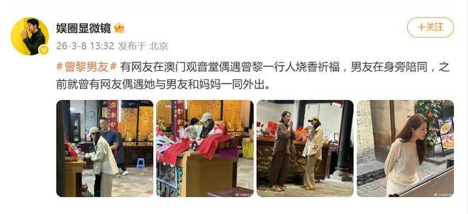 据网友3月8日爆料,近日,49岁的演员曾黎与导演男友王子鸣在澳门观音堂祈福时被偶遇。同行的还有曾黎的母亲和妹妹,一家四口呈现出宛如家庭团建的温馨画面。两人自然流露的默契互动立刻引起了网友关注,被戏称为娱乐圈清流式情侣,令人感受到一份难得的平和与真实。