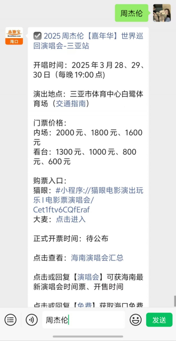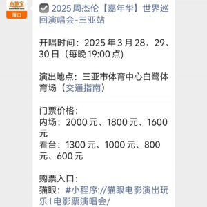 温馨提示:微信搜索公众号【海口本地宝】,关注后在对话框回复【周杰伦】,可获2025三亚周杰伦演唱会最新消息,查看演唱会票价/购票入口(APP/网页/小程序)/抢票攻略、座位图参考/场馆介绍等。