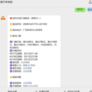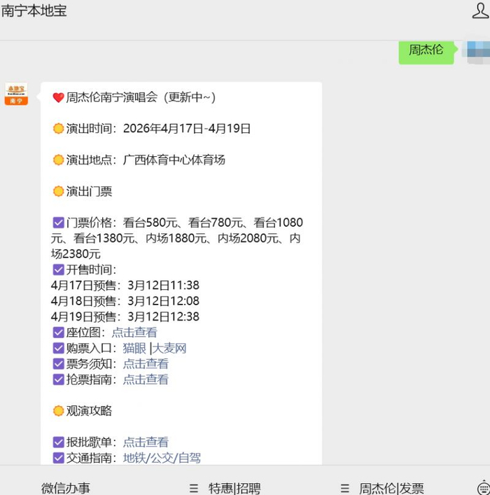 温馨提示:微信搜索公众号【南宁本地宝】,关注后在对话框回复【周杰伦】获取2026南宁周杰伦演唱会时间/地点/价格、购票入口+开售时间+抢票攻略+退票规则、座位图、场馆交通(公交/地铁)、报批演出歌单等。