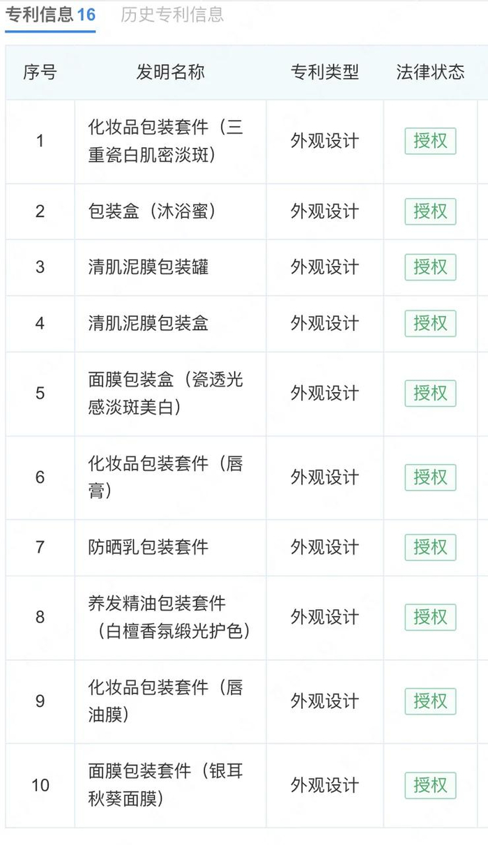 和其他品牌一樣,Fan Beauty幾乎沒有自己的品牌專利。企查查顯示,範美麗(海南)化妝品有限公司名下有16項專利信息,但均是外觀設計專利。