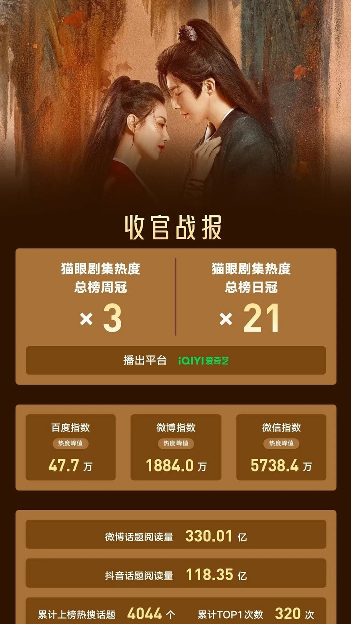 先后21天登顶全网收视率冠军,最高市占率一度达到29.9%,热搜累计上榜超过四千次,几大社交平台的话题阅读量均破百亿。